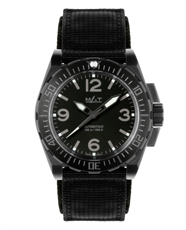 An instrument inspired by the watches of the most prestigious elite units (RAID, GIPN…). Extremely robust due to its monobloc construction with an engraved unidirectional rotating bezel, it features hour, minute, and second functions, and a water resistance tested to 300 meters. This stealthy watch can accompany you in any situation. The hands and dial markers are treated with Super Luminova luminescent material to ensure optimal readability in aquatic environments or at night.